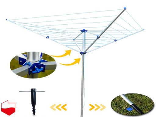 Kupując suszarkę otrzymacie Państwo w zestawie pokrowiec na suszarkę oraz 2 kotwy (do wkręcenia w grunt lub zabetonowania) do szybkiego zamontowania w gruncie