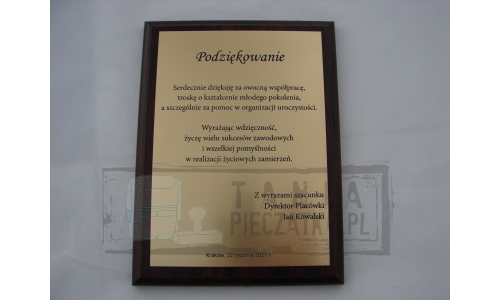 Nagroda, podziękowanie, dyplom, wyrazy uznania w eleganckiej formie graweru na złotym lub srebrnym delikatnym laminacie 0,08mm zamocowanym na podkładzie drewnopodobnym z gotowymi dziurkami umożliwiającym zamocowanie na ścianie.