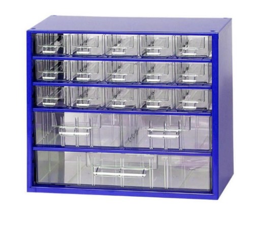 Szufladki modułowe na drobne przedmioty, np części elektroniczne, śrubki, nakrętki.