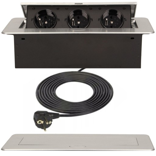 ✅ Konstrukcja składa się z obudowy, którą należy zamontować w blacie o grubości min. 25 mm oraz górnego panelu w którym schowane są 3 gniazda z uziemieniem (typ french - z bolcem).