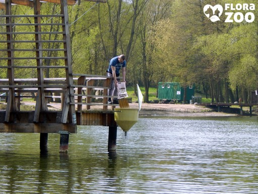Sposób działania karmników jest bardzo prosty. Mocujemy go do pomostu lub na żerdziach w dowolnym miejscu. Ryby przepływając pod karmnikiem, wprawiają w ruch ramię i strącają granulki do wody, a później je zjadają.