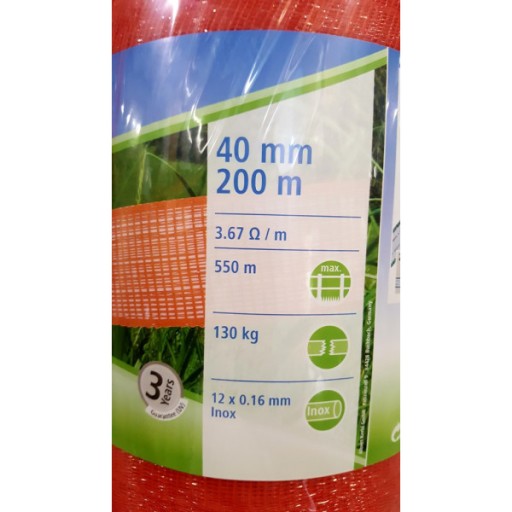 Produkt o bardzo dobrych parametrach wytrzymałościowych wyprodukowany w Niemczech. Taśma do ogrodzeń elektrycznych wykonana z wytrzymałego materiału odpornego na promienie UV co znacznie zwiększa trwałość produktu. Dobre właściwości przenoszenia impulsów elektrycznych. Szpula zawiera 200 metrów przewodu o szerokości 40 mm. Jest to najbardziej powszechnie stosowana taśma, która doskonale sprawdza się w średnich i długich ogrodzeniach. Uniwersalna taśma o długości 200 metrów i szerokości 4 cm do ogrodzenia elektrycznego (pastucha).