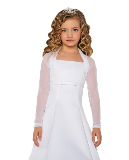 Mamy do zaoferowania Państwu nowe bolerko komunijne z długim rękawem. Wykonane jest bardzo starannie z tiulu elastycznego, dostępne w kolorze białym.