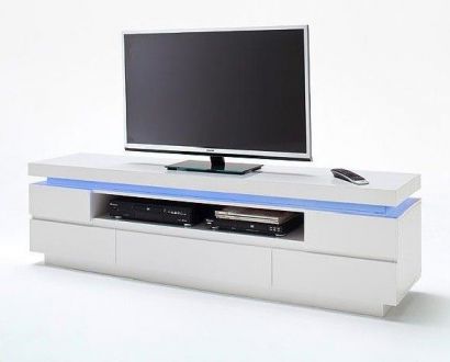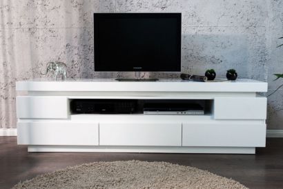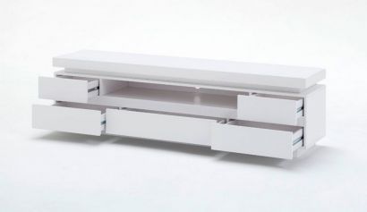 Szafka charakteryzuje się niezwykłą elegancją, prostymi liniami oraz nowoczesnym kształtem. Wykończona na wysoki połysk, kolor biały. Wyposażona w ciekawe oświetlenie LED, które zmienia kolor, sterowane za pomocą podręcznego pilota. Mebel posiada pięć praktycznych szuflad w różnych rozmiarach. Po środku znajduję się wnęka na sprzęt i przydatne akcesoria.