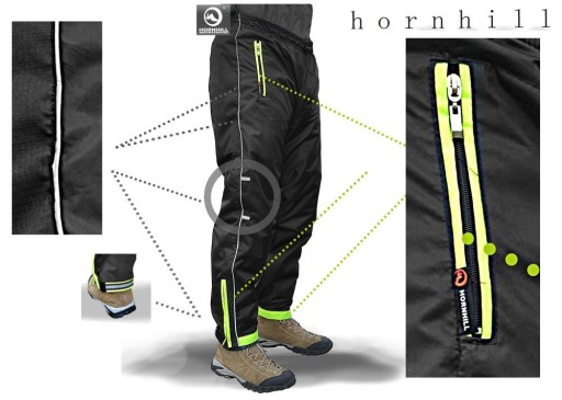R-PACO (reflector pants cover)TO TRZECIE SPODNIE Z SERII HORNHILL PACO. ICH DODATKOWĄ FUNKCJĄ - POZA OCHRONĄ PRZED WIATREM I DESZCZEM - JEST POPRAWA BEZPIECZEŃSTWA (WIDOCZNOŚĆ W DZIEŃ I W NOCY) I WYGODA UŻYTKOWANIA (posiadaja dwie kieszenie, rozpinane nogawki i regulację szerokości nogawek).