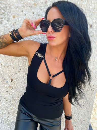 Bluzka posiada bardzo efektowne zdobienie w formie czarnych paseczków oraz aplikacji.