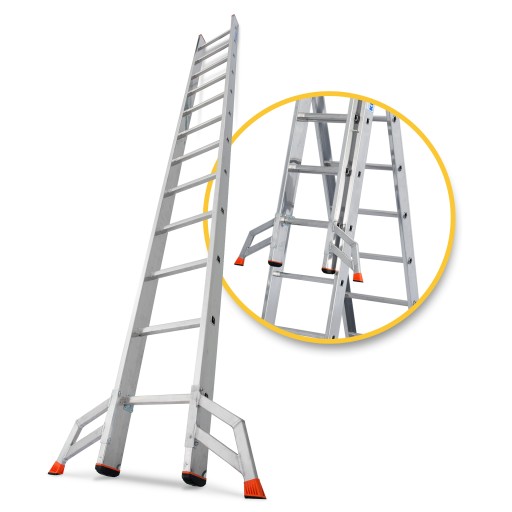 Wyjmowany 3-ci element drabiny pozwala na stosowanie jej jako dwóch niezależnych od siebie drabin (rozstawnej i przystawnej oraz przystawnej wysuwanej i przystawnej jednoelementowej).