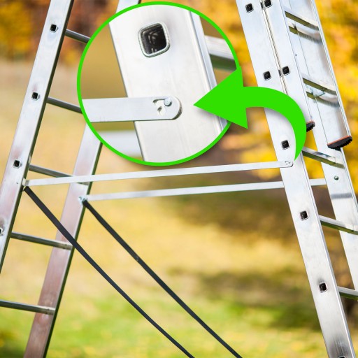 Haki zabezpieczające z zapadkami są solidnie zamocowane do podłużnic drabiny i zabezpieczają ją przed samoczynnym rozłożeniem się drabiny podczas transportu jak również złożeniem podczas użytkowania.