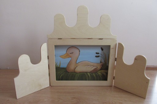 Oferujemy Państwu nowy, drewniany teatrzyk kamishibai, do kart w formacie A3. Teatrzyk wykonany jest ręcznie ze sklejki drzewa liściastego i pomalowany bezbarwnym lakierem. Jego wymiary to : 44/34/6 cm. Drzwiczki teatrzyku wycięte są w kształcie korony, co dodatkowo wzbogaca odbiór wizualny i estetyczny prezentowanej w nim bajki lub opowiadania. Taki teatrzyk to doskonała pomoc dla nauczycieli wychowania przedszkolnego, wczesnoszkolnego, bibliotekarzy, katechetów, animatorów, opiekunek dziecięcych itp. Można go wykorzystać jako innowację pedagogiczną lub metodę nowatorską w swoim miejscu pracy. Istota teatrzyku kamishibai polega na tym, że nauczyciel czyta dzieciom wybraną bajkę a jej treść przedstawiona jest na ilustracjach umieszczonych w drewnianej skrzynce. Więcej informacji w Internecie, na YouTube. Teatrzyk można wykorzystać również na wiele innych sposobów, do kreatywnej zabawy w teatr z wykorzystaniem pacynek, kukiełek, lalek itp. Polecam bardzo, wspaniała zabawa i atrakcja dla dzieci ! Idealny na niepowtarzalny prezent i nie tylko. Na zamówienie robimy też wersję teatrzyku dla osób leworęcznych ( otwór na karty znajduje się po lewej stronie) .W razie pytań proszę pisać lub dzwonić, szybko odpowiem, zapraszam.