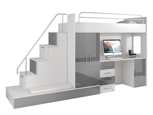 Łóżko cechuję się nowoczesnym wzornictwem oraz precyzyjną jakością wykonania, zapewnia wyjątkowo dobry sen oraz gwarancję bezpieczeństwa i pewność, że Twoje dziecko obudzi się wypoczęte. Fronty zestawu są wykonane z płyty meblowej MDF na wysoki połysk w bogatej kolorystyce, która pozwoli dopasować mebel do każdego pokoju. Górna powierzchnia spania oraz schodki przy łóżku wyposażone są w barierki, chroniące twoje dziecko przed wypadnięciem.