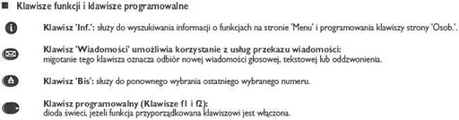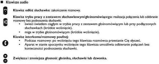 - klawisze OK, wyjścia, wiadomości z diodami LED, zakończenia połączenia, Redial, systemu pomocy, alarmowe, trybu głośnomówiącego, wyciszania mikrofonu,
