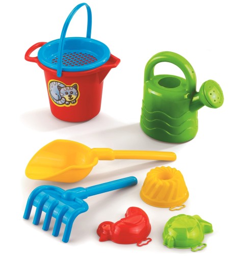 Komplet zawiera wiadereczko, konewkę, sitko, łopatkę, grabki i trzy foremki. Całość spakowana jest w siatkę. Wysokość zapakowanego zestawu ok. 28 cm.