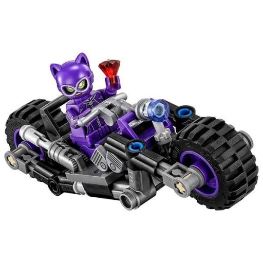 - Motocykl Kobiety-Kot™ ma siedzenie dla minifigurki, drukowaną deskę rozdzielczą, koła z gumowymi oponami, elementy silnika i przezroczyste światła przednie.