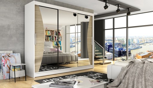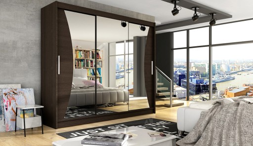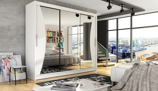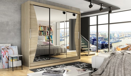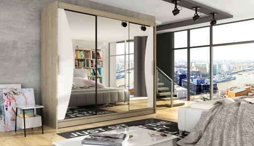 Nowoczesna i bardzo pojemna szafa z systemem drzwi przesuwnych Aston IV o szerokości 250cm. Szafa trzydrzwiowa z lustrem na każdym z drzwi. Ciekawy kształt luster podkreśla nowoczesny design szafy. Dostępna w 6 wersjach kolorystycznych.