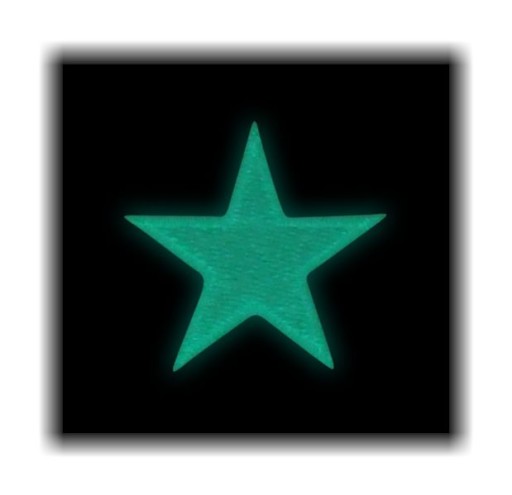 Naszywka GWIAZDA wykonana techniką haft komputerowy. Ukryta w niej moc nici fosforescencji po odpowiednim naładowaniu ( np. światłem żarówki ) w ciemnościach przemienia naszywkę w jaśniejącą blaskiem Gwiazdkę - efekt prezentuje zdjęcie na czarnym tle.