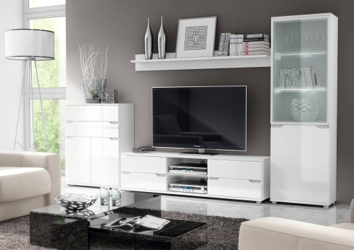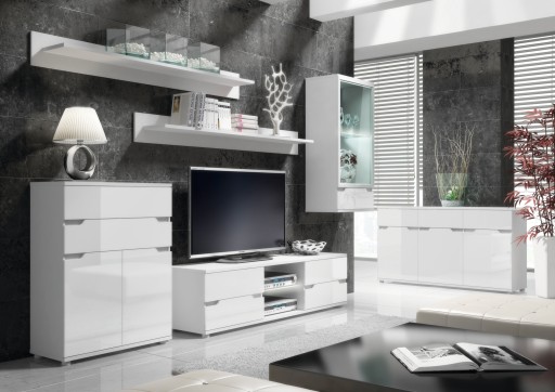 Szafka pod telewizor wchodząca w skład kolekcji utrzymanych w bieli mebli przeznaczonych do salonu lub pokoju dziennego. Kolekcja składa się z elementów, które świetnie zestawiają się w formie meblościanki, jak również w luźnej kompozycji. Szafka została wykonana z najwyższej jakości płyty laminowanej z obrzeżami ABS i frontami MDF w wysokim połysku. Po bokach posiada cztery szuflady, w centralnej części przestronna wnęka na sprzęt przedzielona szklaną półką, która dodatkowo może zostać oświetlona oświetleniem LED (opcja dodatkowo płatna).