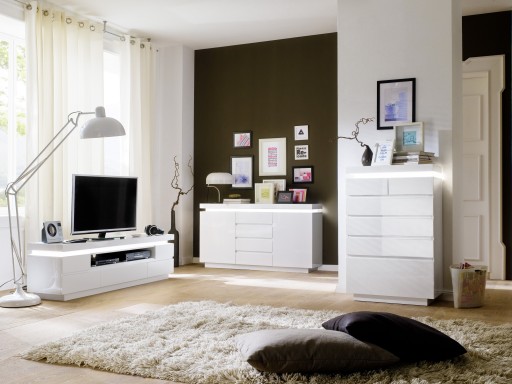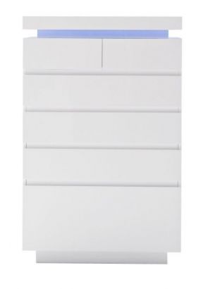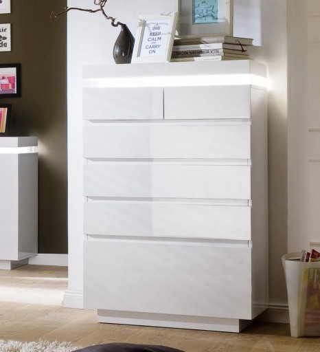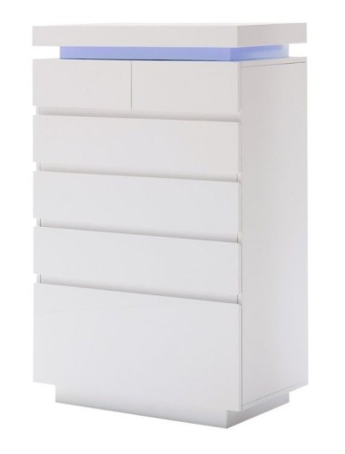 Elegancka komoda z podświetleniem LED zmieniającym kolor sterowanym na pilota. Wykonana z płyty MDF, wykończenie w wysokim połysku. Mebel posiada cześć szuflad w trzech różnych rozmiarach. Dzięki temu można do niej schować przedmioty mniejsze lub nieco większe. Prezentowana komoda to ciekawa forma i unikalny design idealny do pomieszczeń urządzonych w nowoczesnym stylu.