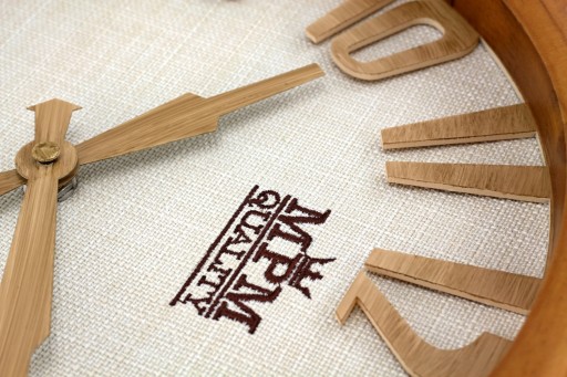 Zegar posiada stylową drewnianą obudowę, wskazówki oraz cyfry w połączeniu z doskonale współgrającą, tekstylną tarczą, na której wyhaftowane jest logo producenta.