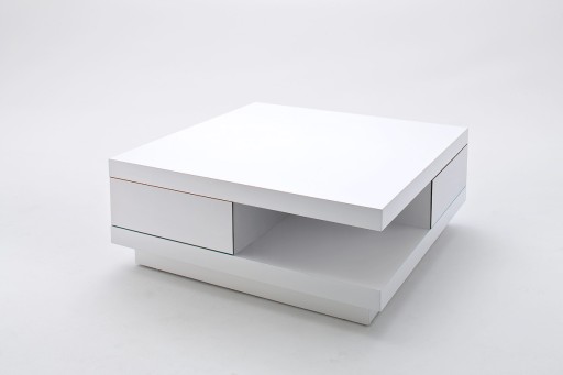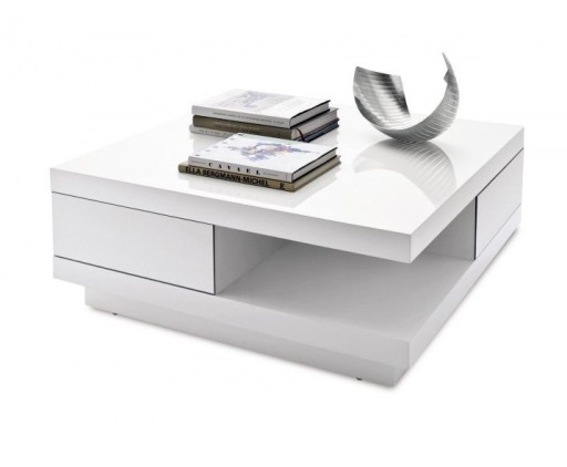 Nowoczesny stolik kawowy w wysokim połysku o kwadratowym kształcie. Posiada praktyczne szuflady na drobiazgi, które zwiększają jego funkcjonalność. Wykonany z płyty MDF lakierowanej na wysoki połysk, kolor biały.