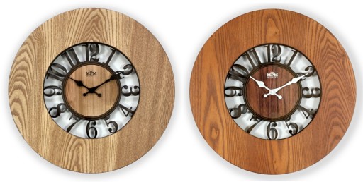 Zegar dostępny jest w dwóch wariantach kolorystycznych: jasnym brązie z czarnymi wskazówkami i logiem oraz ciemnym brązie z białymi wskazówkami i logiem.