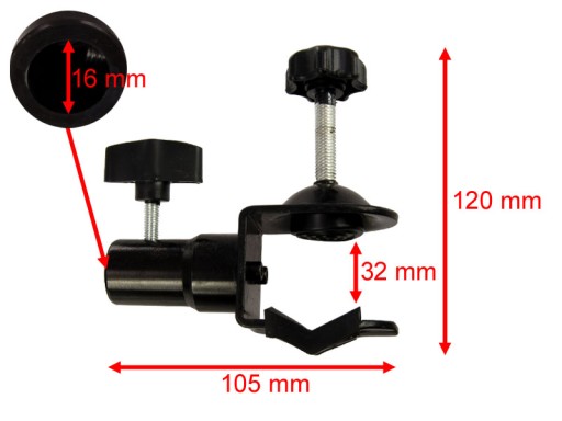 Uchwyt wielofunkcyjny z możliwością zamocowania na statywie z końcówką studyjną 16 mm, a następnie w pozycji prostopadłej można zamontować w imadle uchwytu wszelkiego rodzaju belki, poprzeczki, rurki o średnicy do ok. 32 mm.