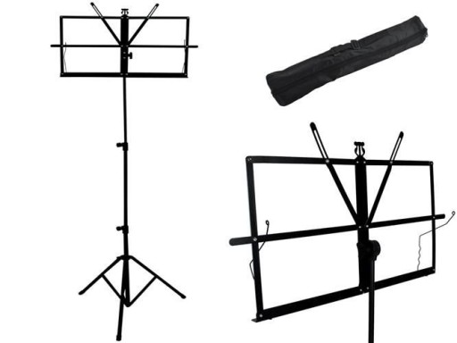 Można położyć stojak nawet na stole (ustawiając statyw na najniższej wysokości). Dodatkowo można regulować kąt nachylenia pulpitu, a regulowane czółka zapobiegają zamykaniu się nut.