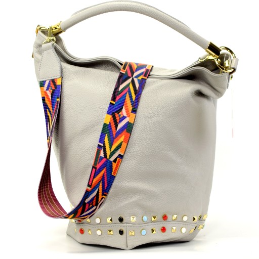 Dwa odpinane paski ; jeden kolorowy parciany aztecki wzór, drugi skórzany służący jako raczka.. Na dole ozdobne koraliki.