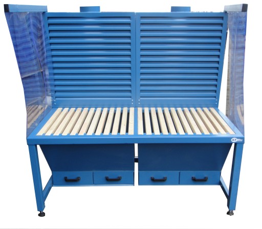 - osłony boczne z bezbarwnymi lamelami odchylanymi z trudnopalnego PCV, ułatwiają obserwację i zapewniają dobre doświetlenie powierzchni roboczej, tłumią hałas i zatrzymują odpryski metalu i ścierniwa