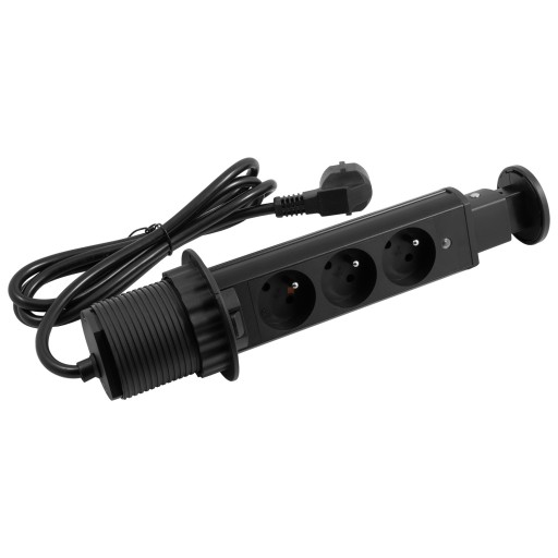 Przedłużacz biurkowy z miejscem na trzy wtyczki, chowany w blat biurka lub stołu to wysokiej klasy produkt z zabezpieczeniem antyprzepięciowym oraz przed przegrzaniem. Nowoczesne rozwiązanie pozwala na schowanie gniazdek oraz kabli pod blatem.