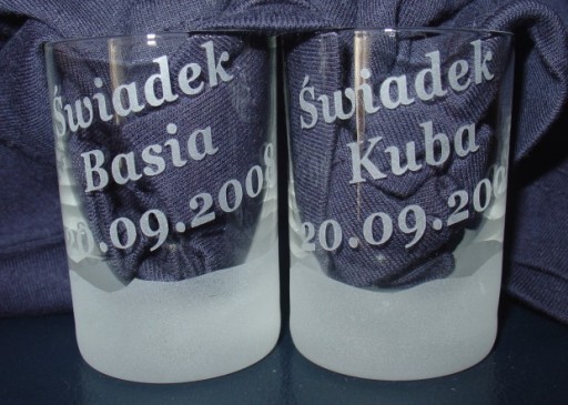 Grawerowane kieliszki do wódki z dowolną personalizacją. Grawer wykonany metodą piaskowania. Efekt jest znacznie ładniejszy aniżeli grawery laserowe.
