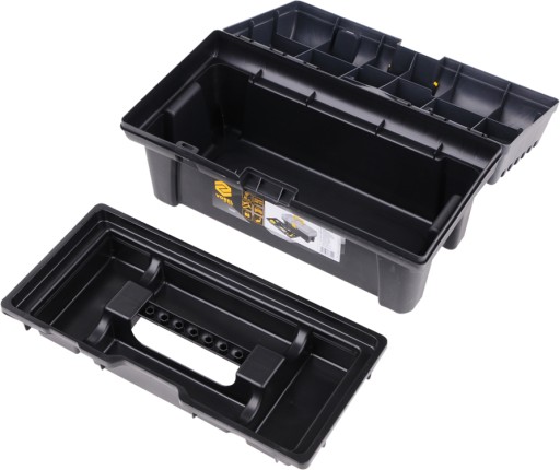 Skrzynka narzędziowa 16" z wyciąganą tacką z uchwytem na bity. Wykonana z tworzywa sztucznego. Solidne zapięcie zapobiega niechcianemu otwarciu w trakcie przenoszenia. Skrzynka posiada specjalnie wyprofilowane boczne uchwyty ułatwiające przenoszenie. Posiada możliwość zamykania na kłódkę. Służy do wygodnego transportu różnego rodzaju przedmiotów, np. narzędzi, akcesoriów wędkarskich, itp.