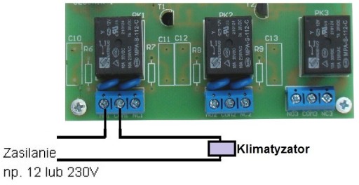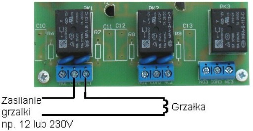 Sposób sterowania urządzeniem grzejącym jest odwrotny. Schemat podłączenia pinów COM oraz NC przekaźnika: