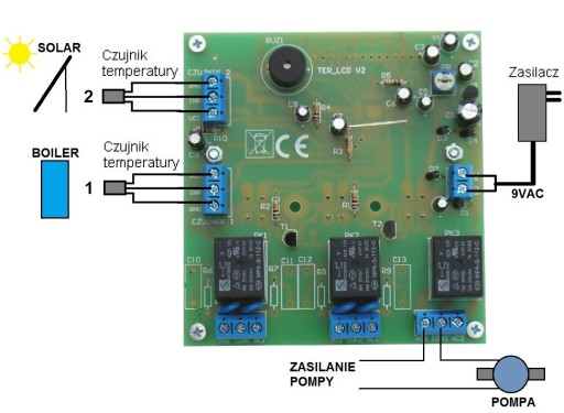 Sterownik służy do sterowania urządzeń zewnętrznych na podstawie temperatur odczytywanych z dwóch czujników. Są to cyfrowe czujniki nie wymagające kalibracji DS18B20. Sterownik posiada 3 kanały wyjściowe przekaźnikowe oraz wyjście alarmowe (buzer). Wszystkie informacje wyświetlane są na wyświetlaczu LCD sterownika a ustawień dokonujemy za pomocą trzech przycisków (tzw. Interaktywne menu).