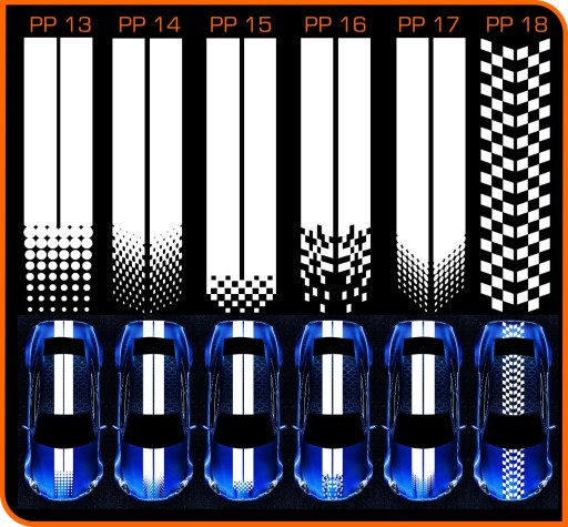 Oferujemy zestaw pasów o łącznych wymiarach 360 x 29 cm, podzielonych na trzy segmenty, każdy po 120 cm x 29 cm lub dwa segmenty 180 x 29 cm. Ilość ta pozwala na oklejenie każdego auta osobowego (maska, bagażnik, dach).