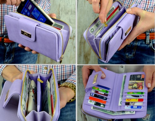 Portfel posiada 29 różnych komór i kieszonek: na banknoty, monety, karty bankowe, zdjęcie, dokumenty (m.in. dowód rejestracyjny)
