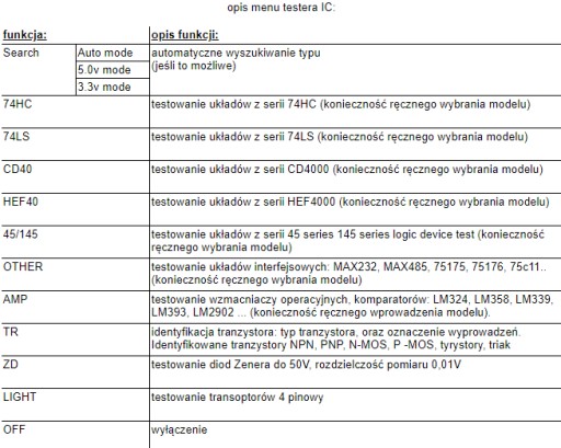 Wielofunkcyjny tester układów scalonych jest profesjonalnym instrumentem przeznaczonym dla inżynierów, personelu serwisowego, elektroników. Różne tryby testowania - można wybrać : tryb 5V lub 3,3V, tryb AUTO, 74HC, 74LS, CD4000, HEF400, 4500, wzmacniacze operacyjne, układy interfejsowe, transoptory, diody zenera, tranzystory.