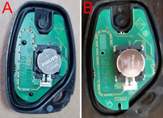 Uwaga! Istnieją dwa typy płytki elektroniki występujące dla tego rodzaju kluczyka. Wersja A pasuje bez problemu (trzeba ją tylko docisnąć między gumowe uszczelki). Wersja B nie będzie pasować. Niestety producent nie przewidział takiej wersji. Można ją dopasować do tej obudowy, ale będzie konieczne podpiłowanie płytki elektroniki oraz wycięcie niepotrzebnych elementów obudowy.