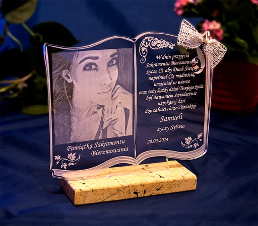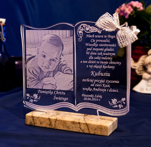 Na pamiątce wygrawerujemy Państwa zdjęcie, dedykacje, życzenia, imię dziecka, miejscowość oraz datę uroczystości.