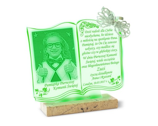 Piękna akrylowa statuetka z Twoim zdjęciem umieszczona na marmurowej podstawce. Statuetka jest idealną pamiątką dla dziecka z okazji przyjęcia sakramentu Chrztu lub Pierwszej Komunii Świętej oraz Bierzmowania.