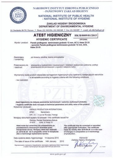 Panele przez nas sprzedawane są przebadane przez Narodowy Instytut Zdrowia Publicznego i posiadają Atest Higieniczny, dzięki temu mają Państwo pewność, że nasze panele w pełni spełniają polskie normy i nadają się do użytku publicznego.