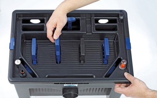 Wydajny filtr przepływowy do stawów ogrodowych i rybnych. Połączenie gąbki filtracyjnej o różnej gradacji daje najlepszą wydajność filtra: różne gąbki filtracyjne zapewniają optymalną filtrację mechaniczną i biologiczną. Do czyszczenia filtr przepływowy posiada dźwignie do wyciskania brudu z gąbek filtra, a także dolny odpływ i przyłącze do czyszczenia.