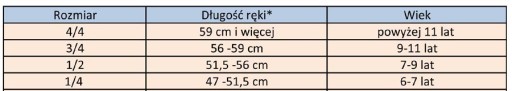 Dobierz odpowiedni rozmiar skrzypiec dla siebie, poniżej orientacyjna tabela: