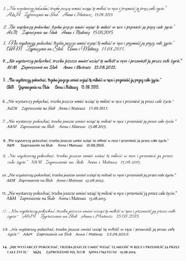 - wygląd i treść zaproszenia, wierszyki/cytaty, prośby (do wyboru)