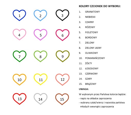 - napis na okładce, cytat/wierszyk i nazwiska państwa młodych w kolorze (15 kolorów do wyboru)