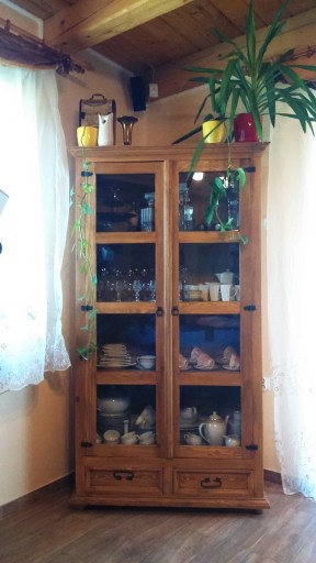 - Drewniana Witryna prezentuje sie naprawdę wyjątkowo dzięki regularnym i unikatowym kształtom ,wewnątrz umocowano cztery półki ,które są bardzo praktyczne przy tym meblu,oraz dwie funkcjonalne szuflady,dodatkowo cały charakter podkreślają ręcznie kute okucia ,jak i zawiasy ,mebel tak wykonany nadaje duszy w pomieszczeniu w którym się znajduje