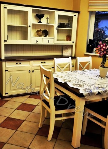 - Kredens Drewniany Składa się z dwóch części -nadstawki i komody oddzielonej od siebie blatem.Nadstawka Kredensu posiada przeszklone podwójne drzwi oraz polkę po środku,natomiast pod blatem znajdują sie dwie funkcjonalne szuflady wysuwane na drewnianych prowadnicach ,a pod nimi zamykane szafki.Całość wzbogacają ręcznie kute pordzewiałe zawiasy i uchwyty,które nadają duszy meblom z tej