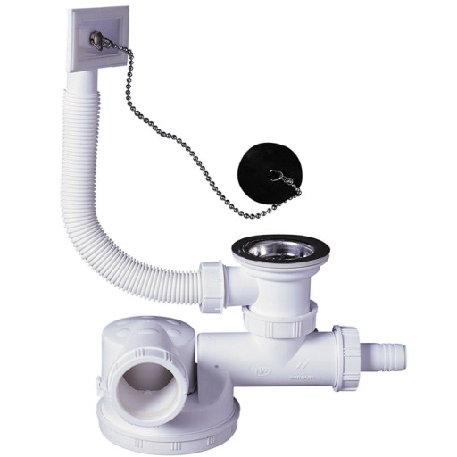 Syfon do zlewozmywaka pojedynczy niski ze spustem fi 70 mm, z przelewem i wyjściem do podłączenia zmywarki lub pralki firmy WIRQUIN