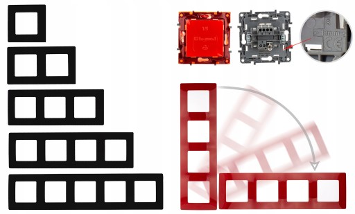 - Ramki w 5 kolorach, w systemie wieloramkowym (1x 2x 3x 4x i 5x) do montażu poziomego i pionowego