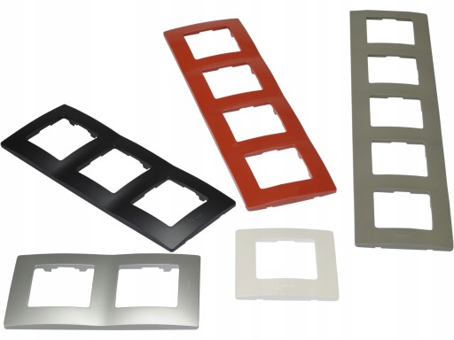 - Ramki w systemie wieloramkowym (1x 2x 3x 4x 5x) w pięciu popularnych kolorach: białym, popielatym, czerwonym oraz aluminium i grafit (do max 3x)
