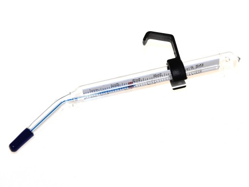 Opis towaru: Termometr - według producenta przeznaczony do kuwet, ze szklaną obudową, z alkoholem zabarwionym na niebiesko. Zakres pomiaru temperatur: 15 do 50 C. Ma kilkanaście centymetrów długości, część końcowa mierząca 4,5 centymetra jest lekko zakrzywiona. Przesuwany czarny uchwyt pozwala zawiesić termometr na krawędzi naczynia w którym mierzymy temperaturę przygotowywanej chemii, menzurki, koreksu z chemią lub kuwety. Jest to bardzo wygodne w pracy, nie musimy zanurzać palców aby chwycić termometr czy wyjąć go z cieczy. Termometr szklany mierzy temperaturę wyraźnie szybciej niż plastikowe termometry Kaisera lub Hamy. Termometr kątowy jest bardzo wygodny w pracy ciemniowej - polecam bo używam od lat. Wyraźnie widać na nim zmierzoną temperaturę. Termometr może być sprzedawany bez opakowania kartonowo-plastikowego tylko w opakowaniu zastępczym - foliowej torebce.